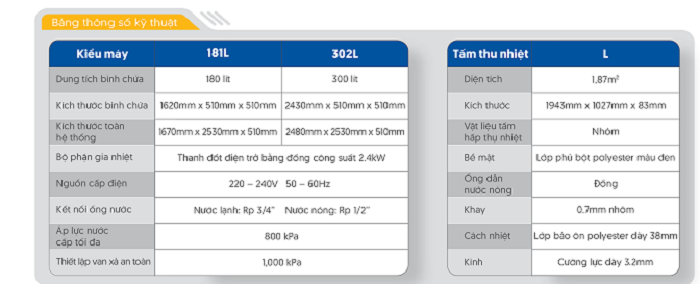 2. THÔNG SỐ KĨ THUẬT Máy nước nóng tấm phẳng chịu áp Solahart 180l